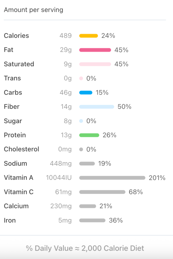 - Dietary Fiber- This recipe is packed with high-fiber ingredients like chickpeas, sweet potato, and kale. Dietary fiber aids in digestion, helps maintain a healthy weight, and lowers the risk of diabetes and heart disease.