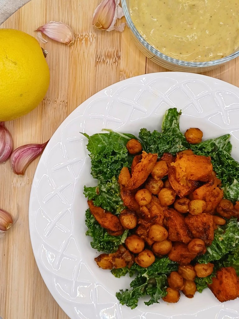 As we jump into the new year with our motivation high, this is the perfect salad to keep us fueled and energized to stick to those new years resolutions. Packed with fiber-rich kale, protein-filled roasted chickpeas, and antioxidant-rich sweet potatoes, it supports digestion, steady energy, and overall wellness. Topped off with a creamy garlic dressing that brings everything together, this salad proves that eating well can be both deeply satisfying and delicious.