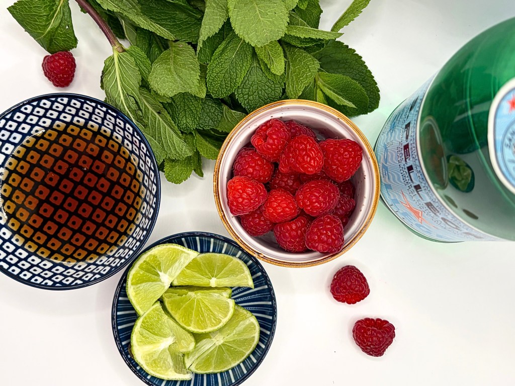 - Divide mint and 1/2 the lime wedges into drinking glasses. Use a muddler or the end of a wooden spoon to mash them together. Divide raspberry puree, ice cubes and sparkling water between the glasses. Stir to combine and garnish with remaining lime wedges. Sprinkle a pinch of sea salt if desired. Enjoy!
