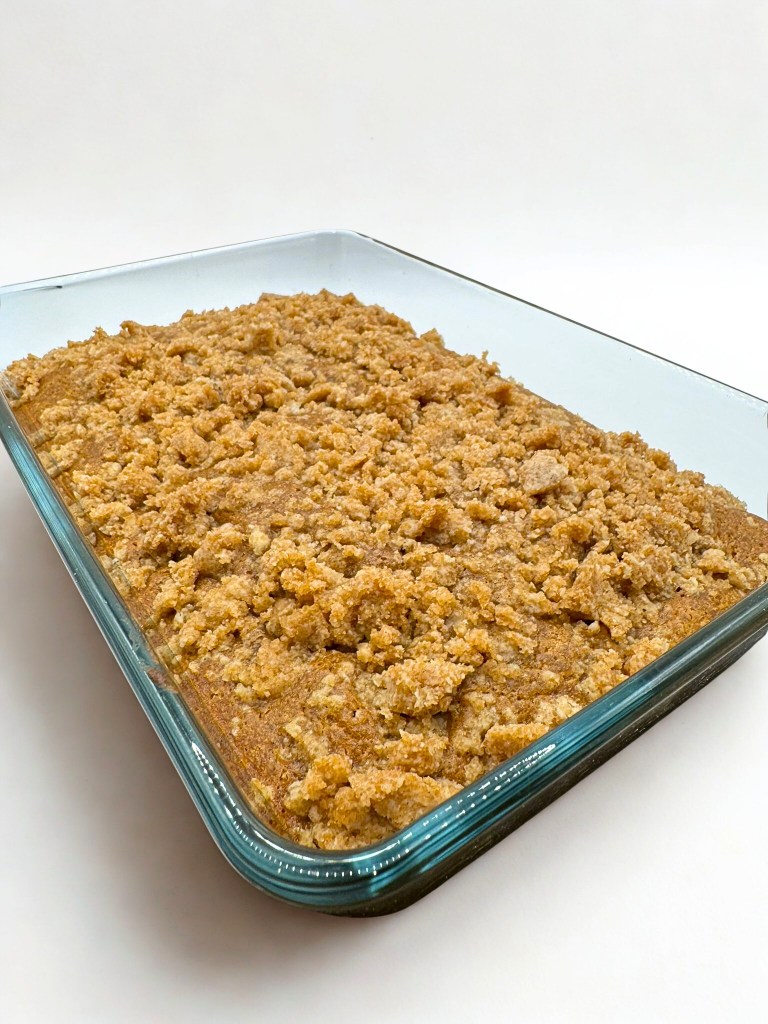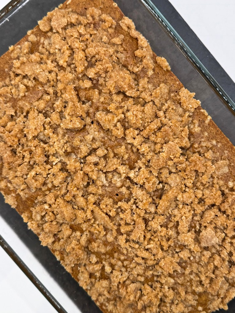 Add the batter into the pan and smooth it out into an even layer. Spread the pumpkin pie spice crumble all over. Bake for 35 to 37 minutes or until a toothpick comes out with a couple of crumbs on it.